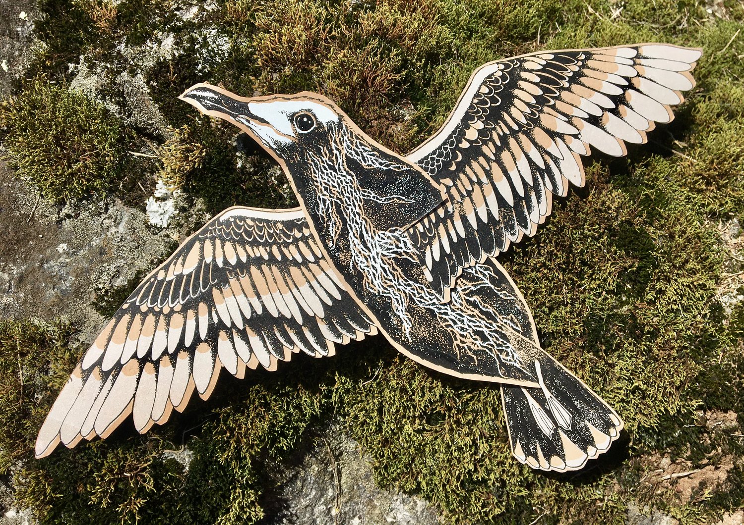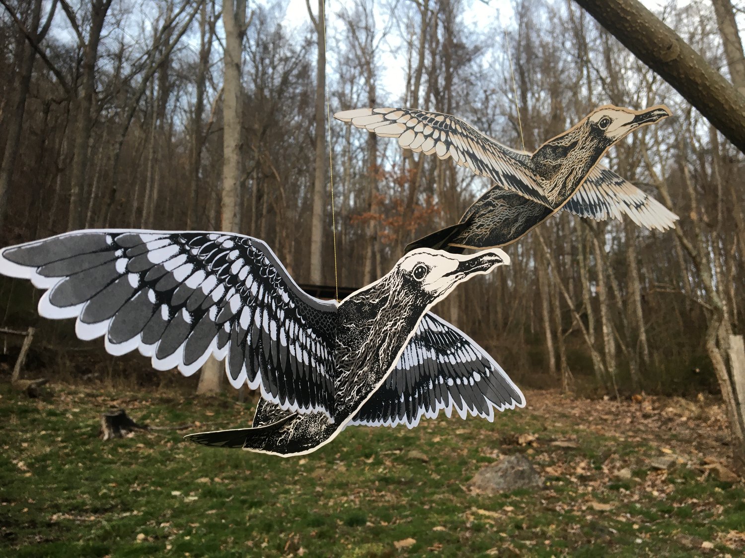Based on original drawings, each bird is silkscreen printed in four layers on card stock and cut from paper by hand, most likely by the wood stove this winter.